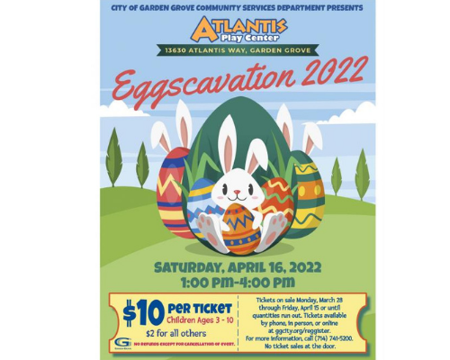 This drive-thru holiday event will be a sweet time for children ages 3-10. Every registered child will get a great bag that will be stuffed with goodie-filled eggs as well as a take-home craft. There will also be a photo chance with the Easter Bunny. Sign-up needs to be done by April 15 by calling 714-741-5200 or online at ggcity.org/reggister. The Eggscavation excitement occurs at the Play Center on April 16 from 1 pm-4 pm.