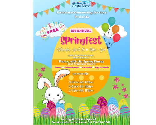 Kids will be roaring with glee on April 16 at Costa Mesa’s Lions Park Event Lawn between 10 am-1 pm. Among the city’s SpringFest highlights are photos with the Spring Bunny and the Egg Scramble, which has three different age groups: 2-4-year-olds (at 10:30 am); 5-6-year-olds (at 11 am) and 7-9-year-olds (at 11:30 am). The Fest also features face-painting, games and other entertainment. No registration required.